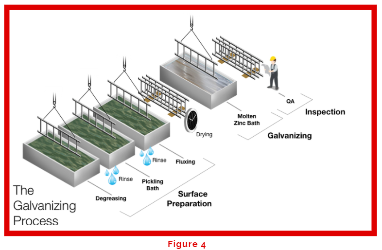 The galvanizing process (Figure 4) begins from pre-treatment stages or also known as ‘Surface Preparation’ where steel has to be properly cleaned to ensure a smooth and quality bonding between the molten zinc and the metal surface takes place when dipped into the kettle.