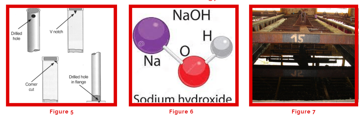 If you look at any galvanizing process, the QA inspection is listed as the final step. However, the first step in the pre-treatment process is the QA checking of the structures that are to be cleaned and galvanized. Every galvanizer should ensure the structures are properly vented for drainage (Figure 5) to avoid any chemicals or zinc to be accumulated within the structures that could cause re-galvanization. Other important parameters to ensure are structure’s size and shape fit into the kettle, welding areas and slags have been cleaned, and proper marking to distinguish the different structures or materials. After that is the degreasing step that removes oil and grease which is commonly achieved with the use of caustic soda (NaOH) (Figure 6) at 10% concentration and temperature of 60°C. Another degreasing method would be the use of an acid degreaser but isn’t as effective as an alkaline degreaser (Figure 7) in removing oil and grease. If proper QA inspection (Figure 8) isn’t done in the beginning, then degreasing will not be 100% effective which leads to poor surface preparation in the following steps hence overall leading to a possible re-galvanization which is costly. Once the structures go through degreasing, they are then rinsed properly with water before being dipped into the pickling bath.